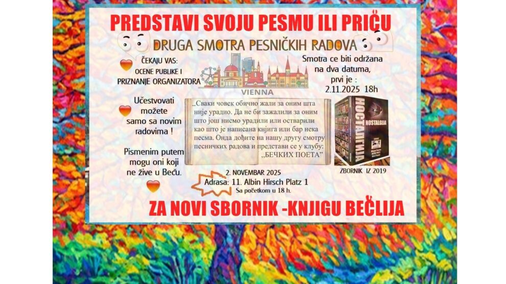 Smotra će biti održana 2.11.25 sa početkom u 18 h. Prijaviti se može svako sa prvim i ne objavljenim radovima. Učestvovati mogu i pismenim putem oni koji ne žive u Beču.Ocene će imati od publike i...